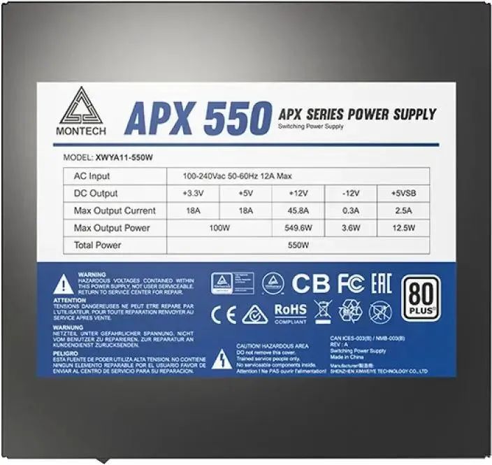 Блок питания Montech APX 550W, ATX 2.43, APFC, 80 PLUS Standard, DC-DC, 120mm fan, non-modular (XWYA11-550W)