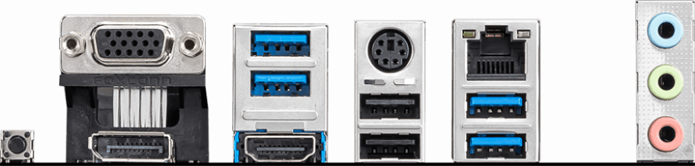 - PS/2, 2 x USB 2.0, 4 x USB 3.2 Gen1, VGA, HDMI, DisplayPort, RJ-45