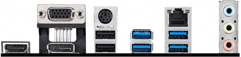 - PS/2, 2 x USB 2.0, 4 x USB 3.2 Gen1, VGA, HDMI, DisplayPort, RJ-45