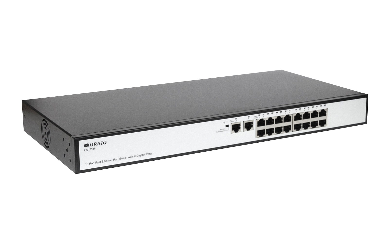Неуправляемый PoE-коммутатор ORIGO OS1218P/190W/A1A, 16x100Base-TX PoE, 2x1000Base-T, PoE Budget 190W, Long-range PoE up to 250m, 19" w/brackets